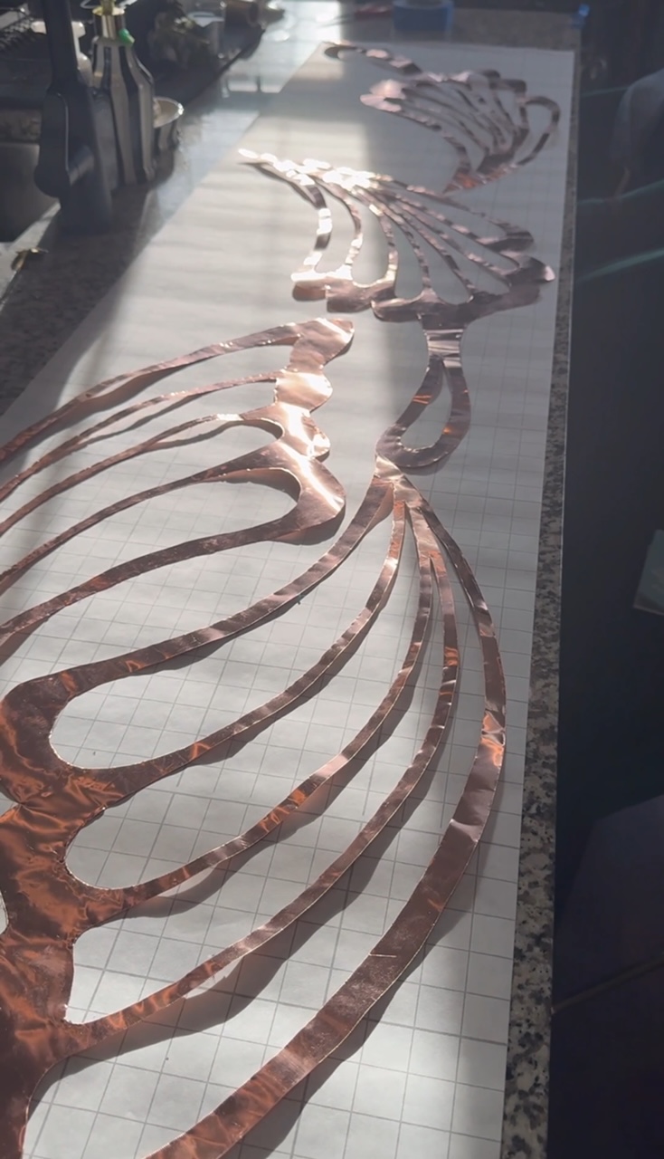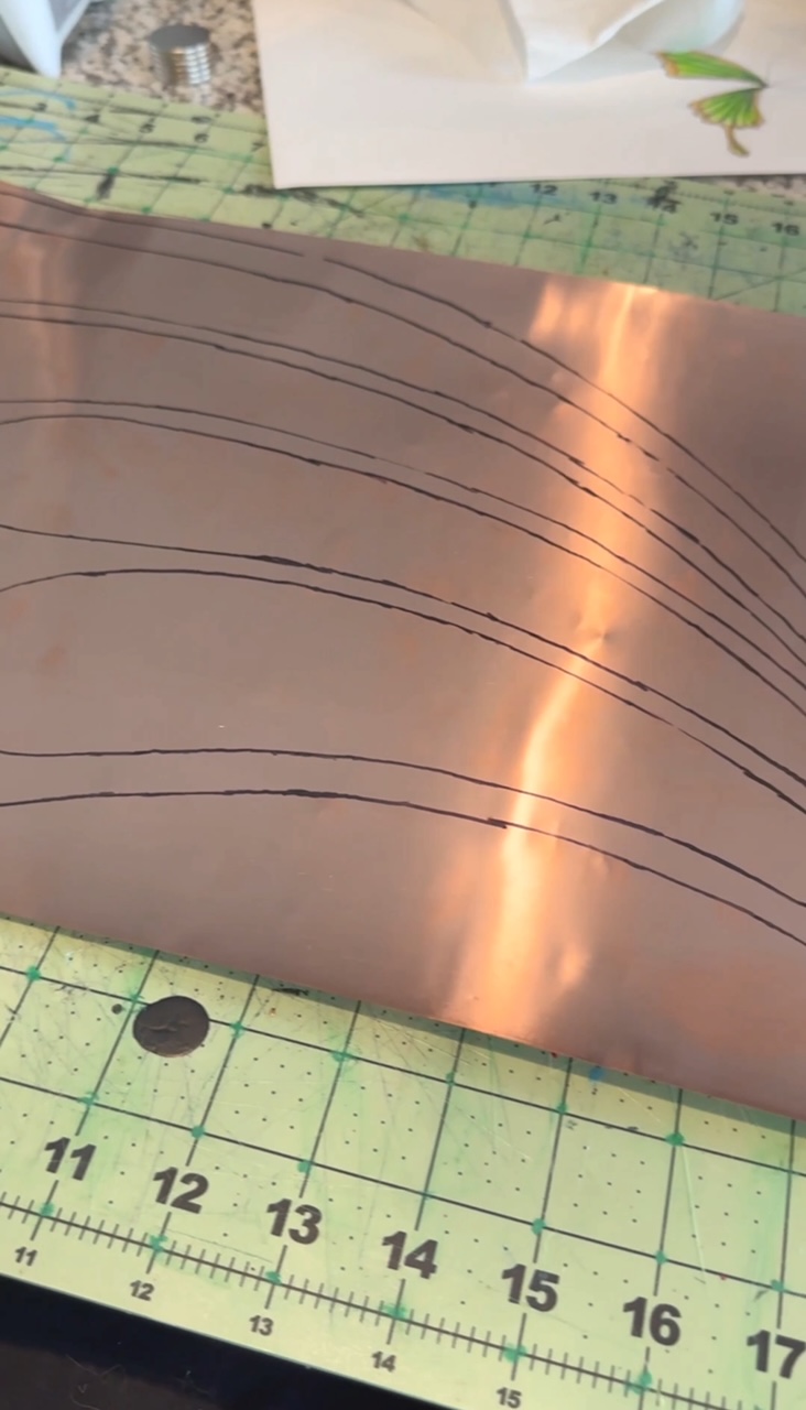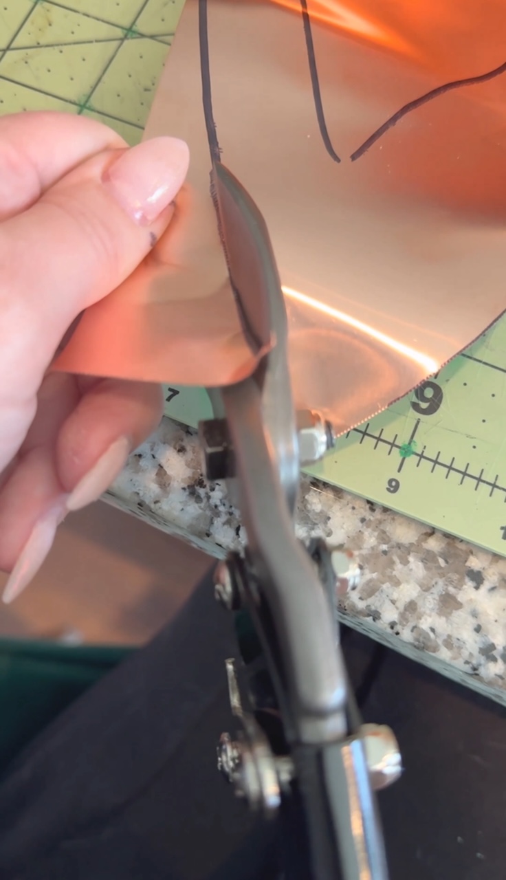 First step is to make a big stencil. I always save the brown paper that comes in Amazon packages, so I slightly ironed it and drew out the design with a pencil and then traced in Sharpie. Then after you cut it out, you’ll trace it onto the copper sheet with the sharpie. The Sharpie lines come off with rubbing alcohol.