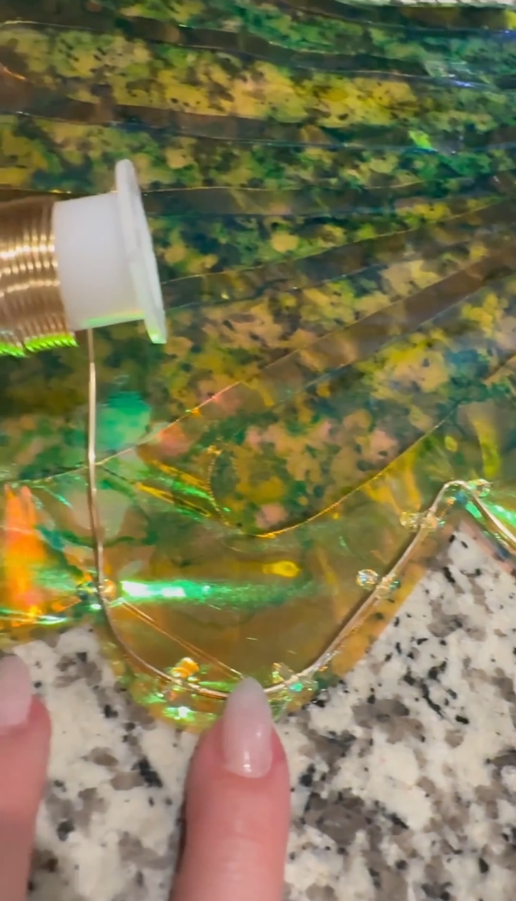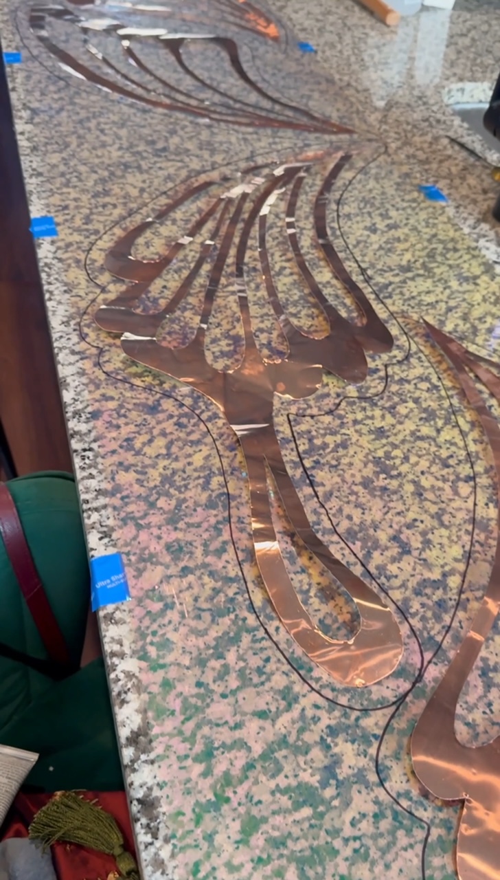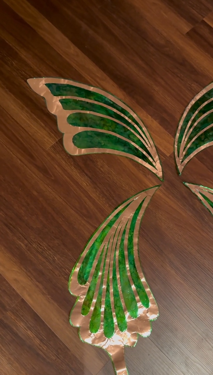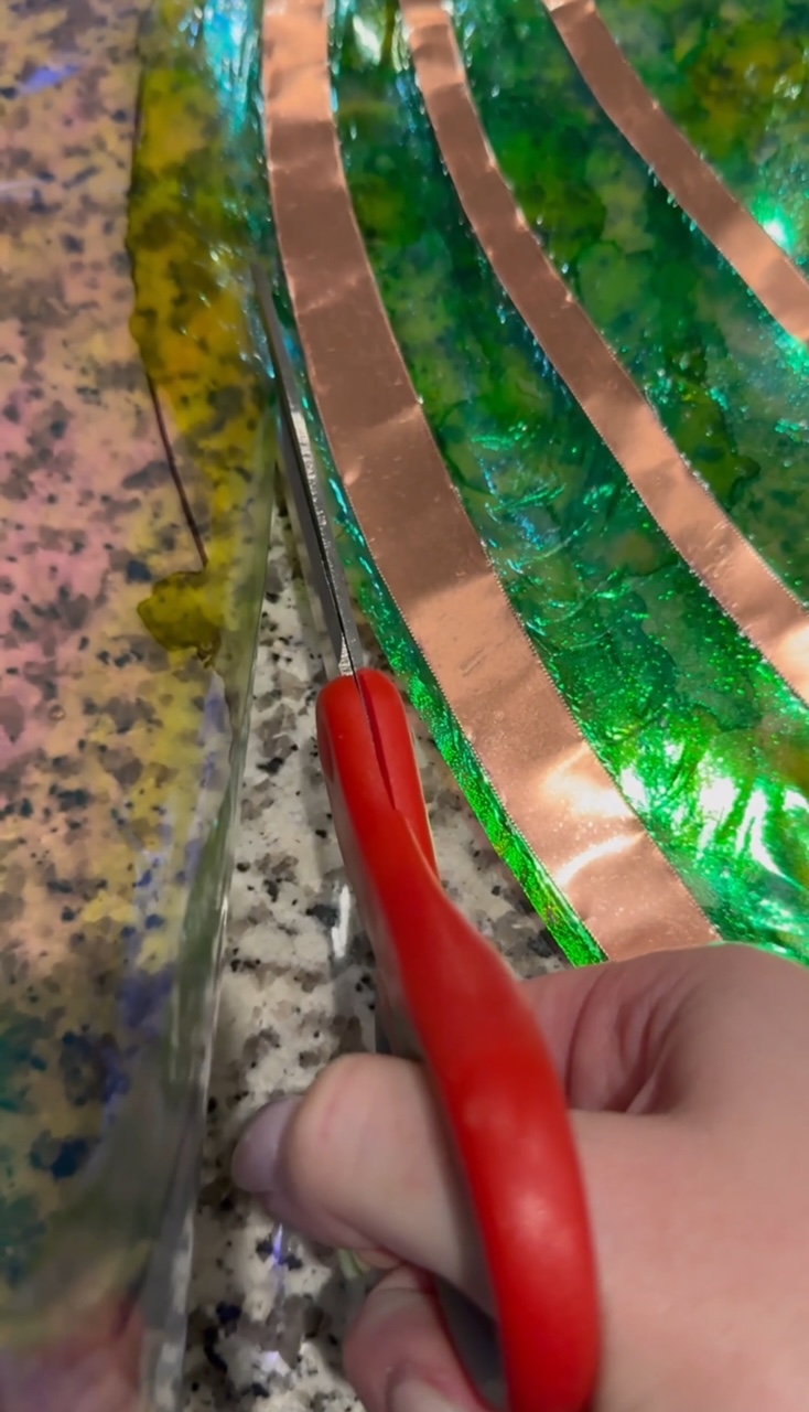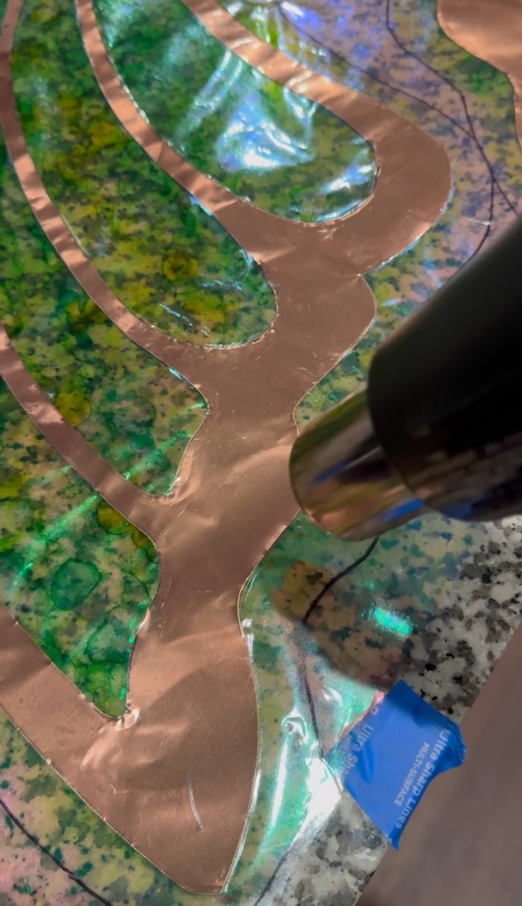 Then you’ll place the copper sheets over the painted cellophane, and carefully roll another layer of the Heat’n bond over the top (avoiding air bubbles).