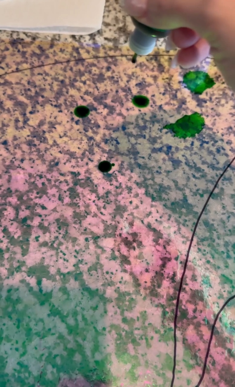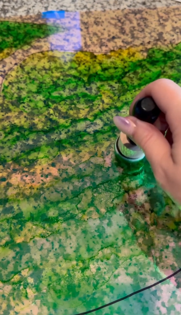 Now it’s time to paint! I did a mix of drops from the alcohol ink bottles and the blending solution and just sort of dabbed around inside the lines.