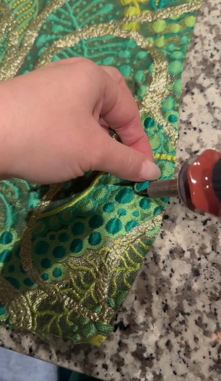 Although beautiful, this is when I realized the 36 gauge copper sheets were a little too heavy and the perimeter wasn’t as stable as I wanted, so I hot glued the 14 gauge wire around the outside. And of course that wasn’t pretty, so I used my soldering iron to cut out brocade fabric to glue over the wire to hide it. The outside brocade actually turned out very pretty!