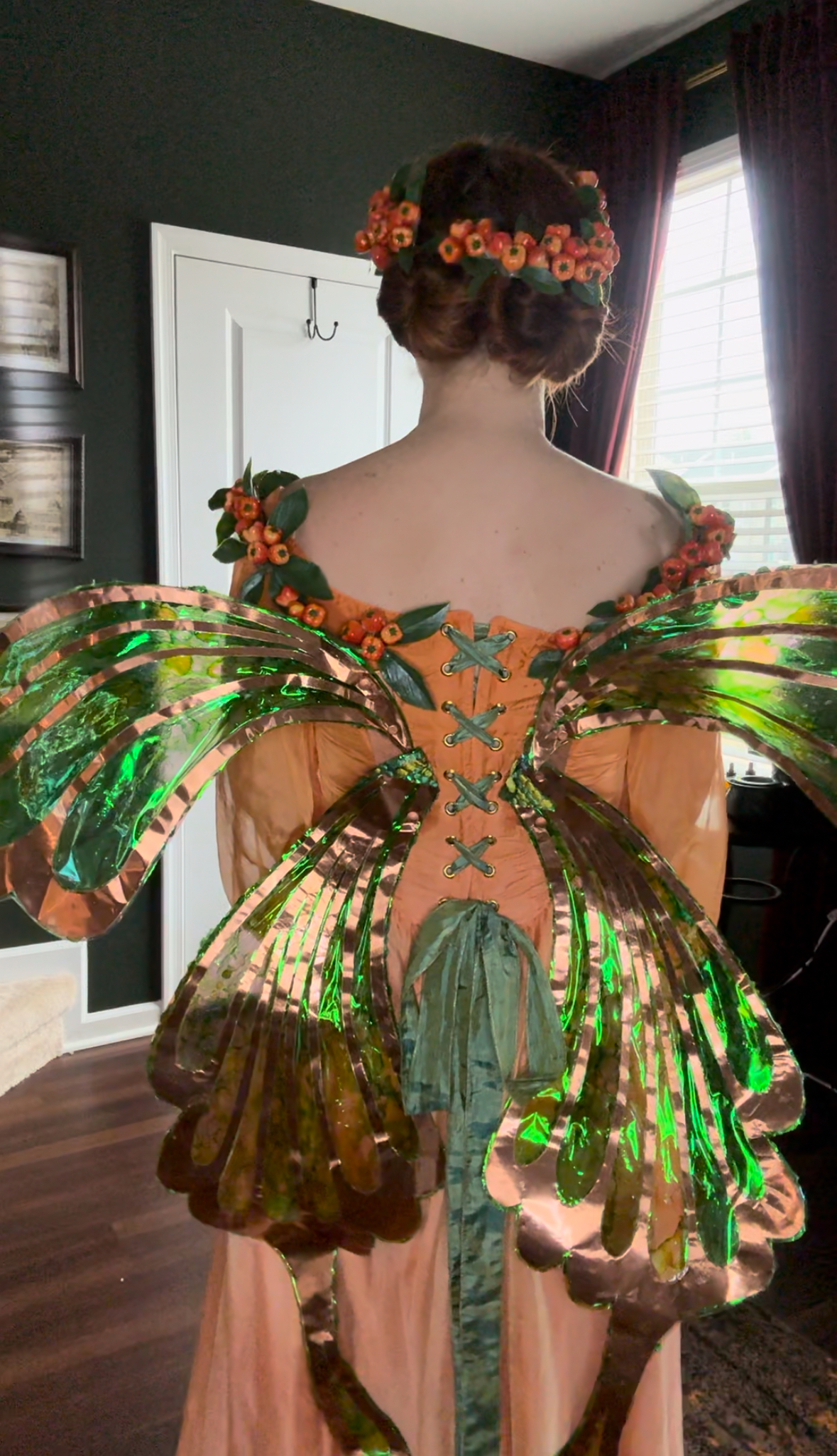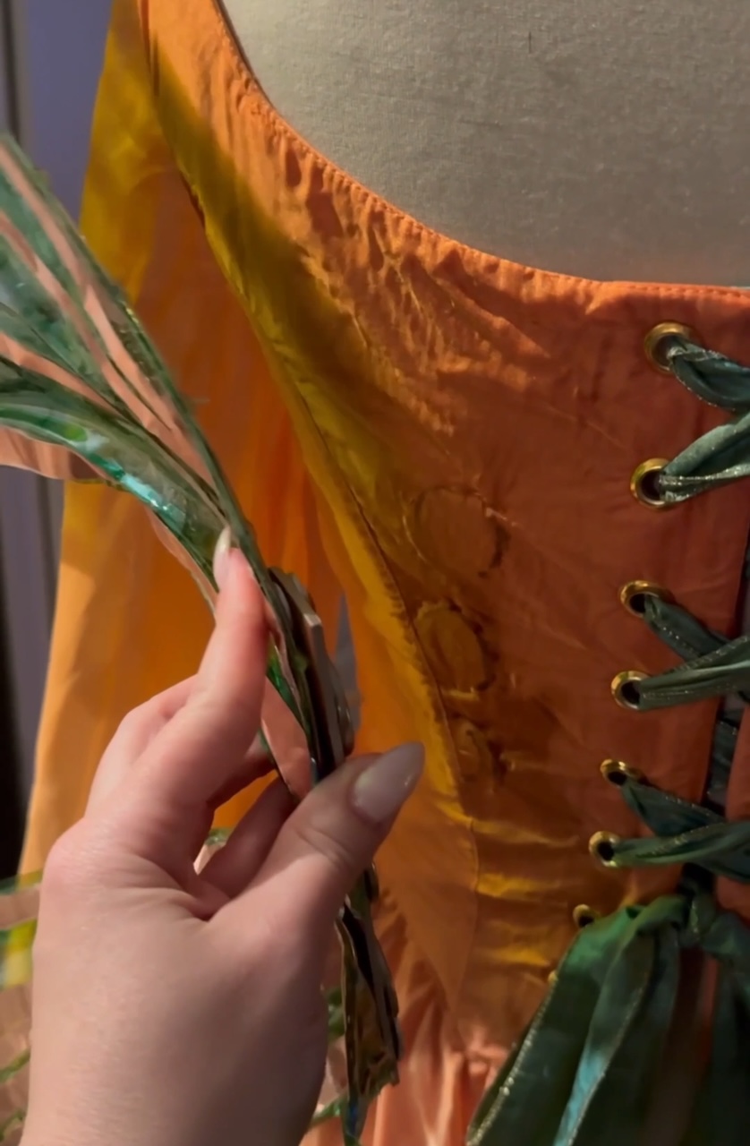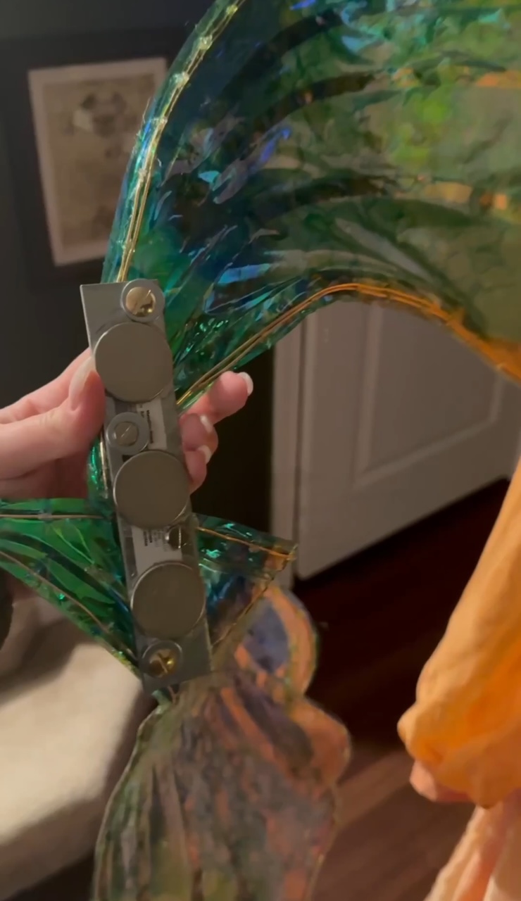 For attaching, you’ll want to use 2 mending plates as the base. I used E6000 to glue the rare earth magnets to one side of each. You might have to glue each one at a time or tape them down while they dry so the magnets don’t try to lift and stick to one another. Then you’ll hold the plate behind your wings and draw a mark to determine where you should cut the holes. Use the washers for added support so your wings don’t rip and then use the Chicago screws to attach the mending plates and washers to your wings. Lastly, I created little pockets on the inside of my dress and sewed magnets inside.