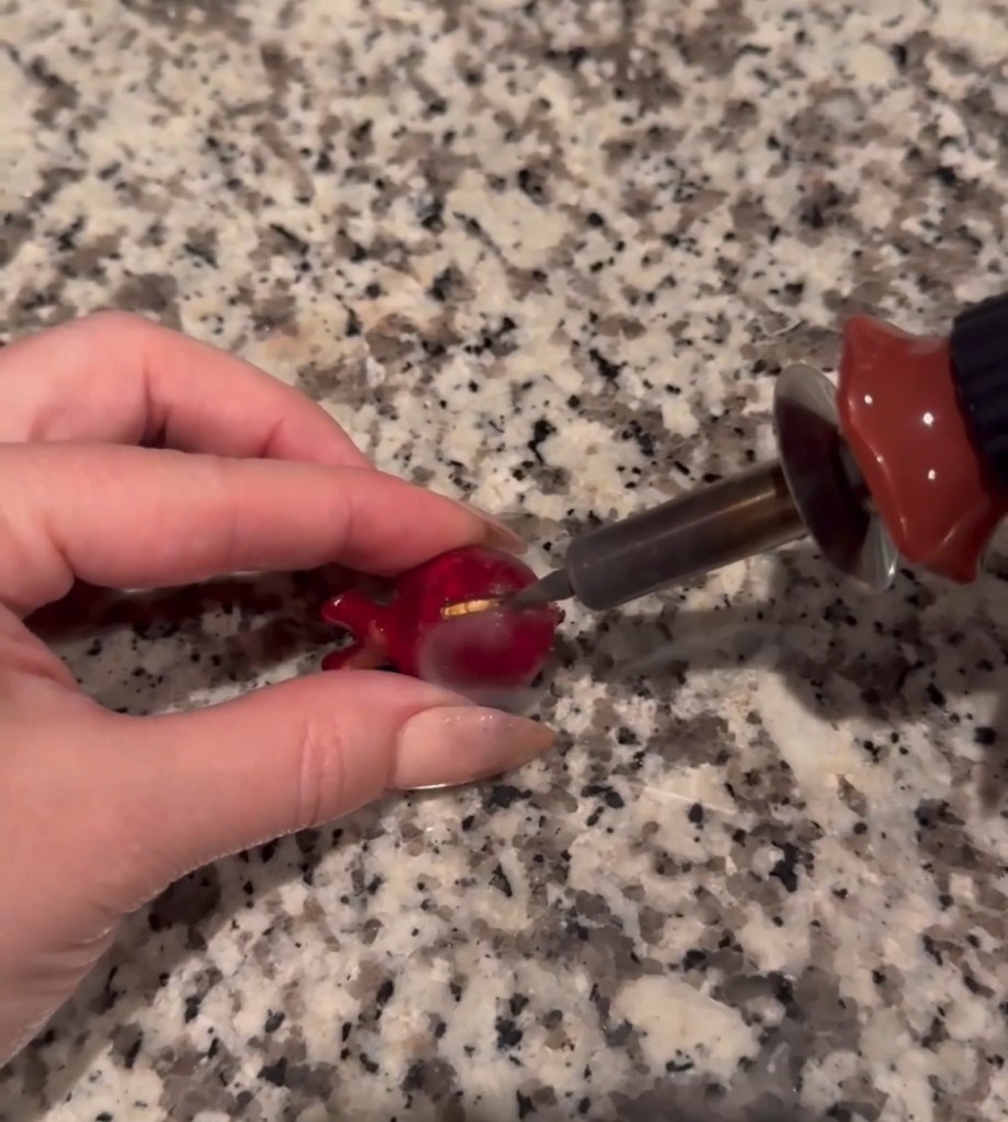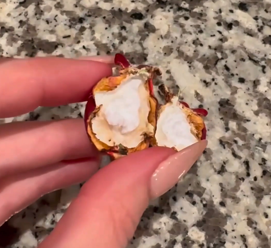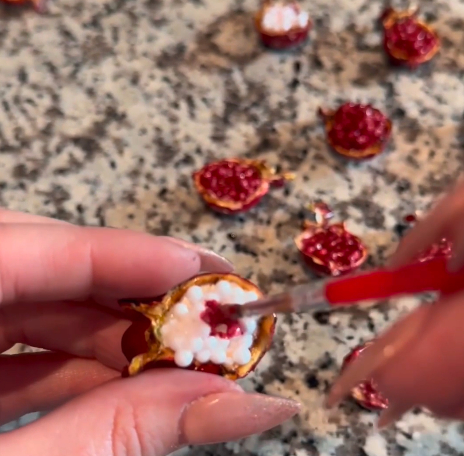I started by using a word burning tool to halve the majority of the rose hip buds (aka the mini pomegranates). I set aside about 1/3 to remain whole.