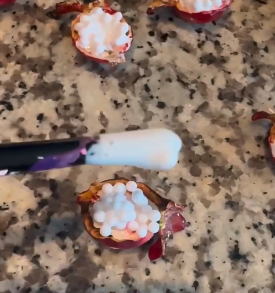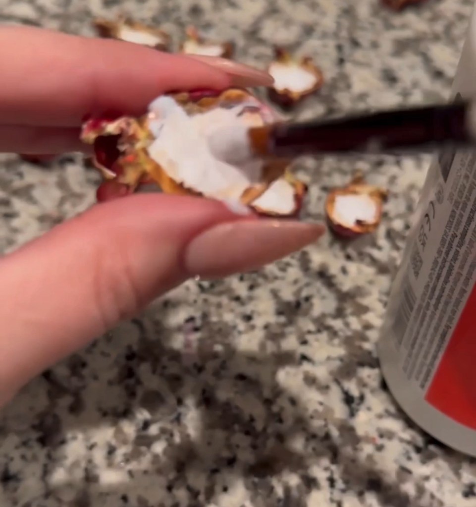 Next, I painted some Mod Podge inside the fruit halve and dipped it into the foam seeds.