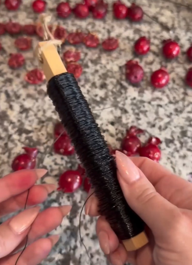 Then to make the seeds look a little thick and syrup-y, after the seeds dried, I added more glossy Mod Podge. Once all the glue dries, you can paint the seeds with acrylic paint. I used a few different shades of dark red, starting with the darkest paint first to fill the grooves, and then highlighting the berries with the lightest paint. Next, you’ll cut strips of thin wire that can be strung through the berries. You can cut each one about 4 inches long.